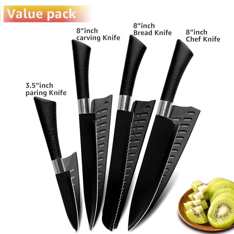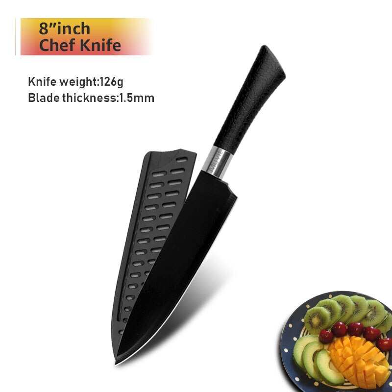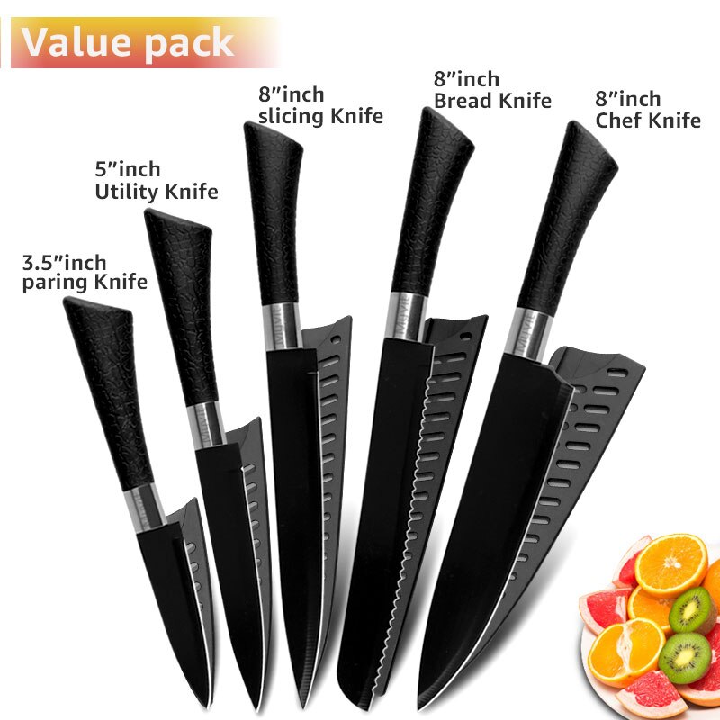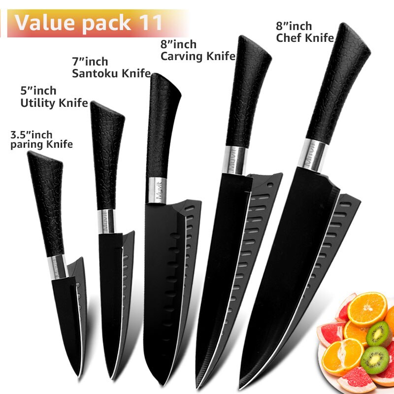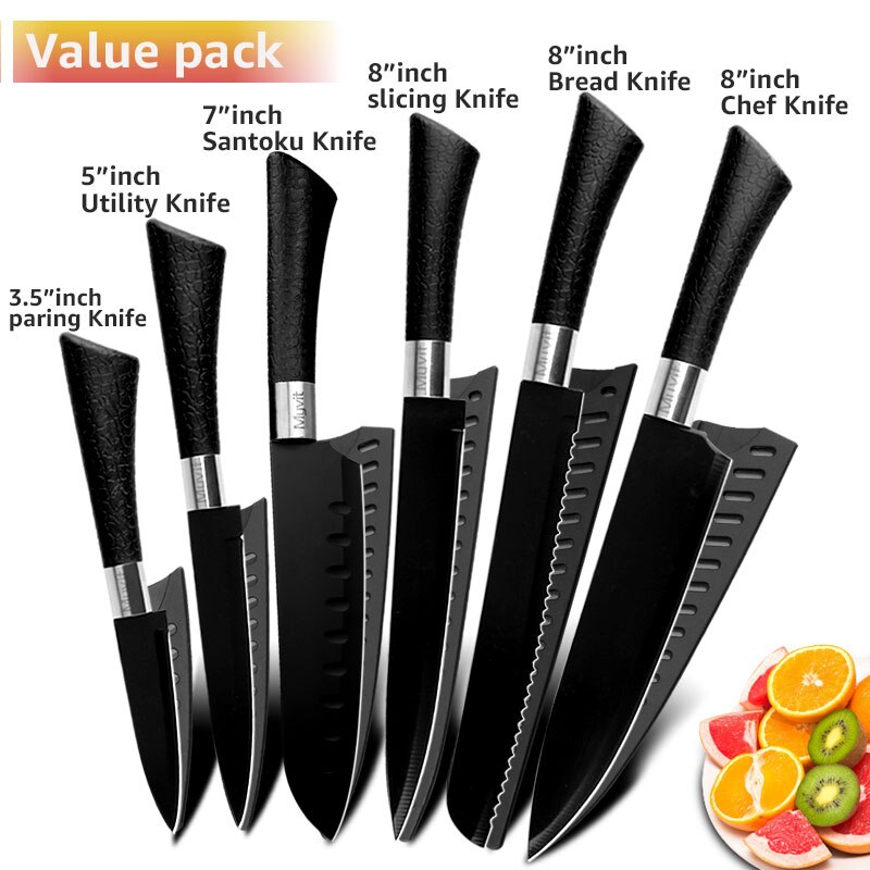 Chef Knives Set Stainless Steel Paring Utility Santoku Chef Slicing Bread Knives Black Blade Kitchen Accessories Set Tools